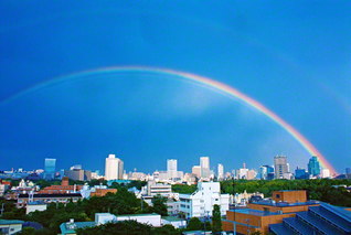 東京の空に、虹が大きな弧を描いた。七色の光は木々の緑を輝かせ、家々をやさしく包み込む。2002年(平成14年)5月、池田大作先生が新宿区内で撮影した一枚である。